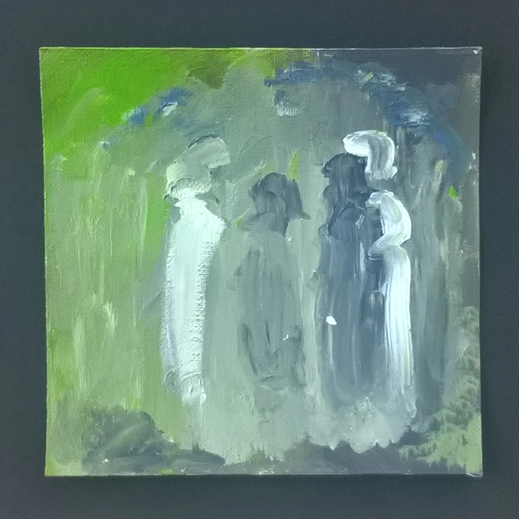Mand og kvinde står i omfavnelse, manden er omgivet af en usynlig hinde der hindrer ham i at vise hengivenhed til kvinden. I bagrunden står en anden kvinde, som i tåger kalder på manden... Bag hende ses en drøm eller et minde om et dansende og elskende par ...